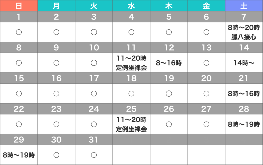 7日(土)は臘八接心という特別な座禅会をします。詳細はお尋ねください。